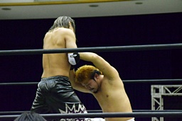 ロックアップ、塚本バック取る、HAYATA腕を取って切り返す(右写真)。塚本はホイップからアームロック、久保にタッチ。