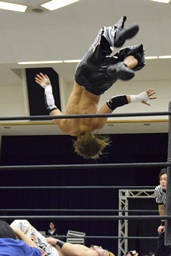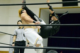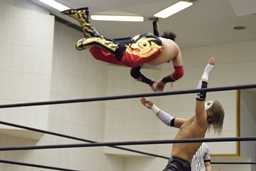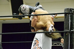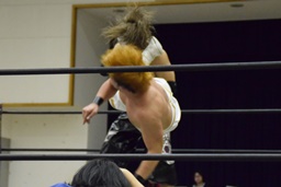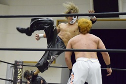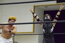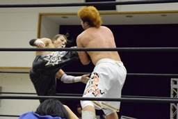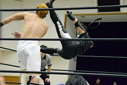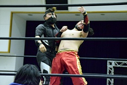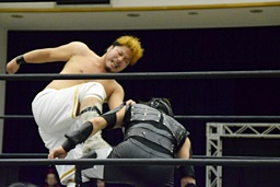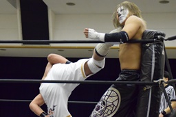 塚本がFUMAの腕を固定し久保がコーナーからダブルアックスハンドル(左写真)。