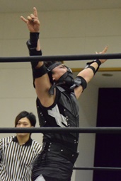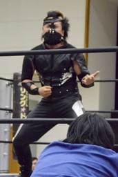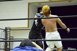 久保エルボースマッシュ(右写真)、ロープに振ってのヒップトスから十字、FUMAロープ。久保ストンピング、塚本にタッチ。