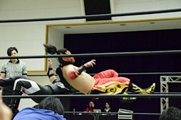 HAYATAハンドスプリングハイキック(右写真)で塚本を場外に落とし、