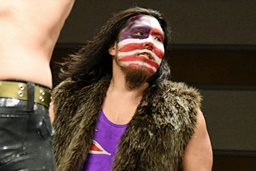 福田がマイクを奪い取り通訳「SAGATはこう言っている!おいFUMA、円華!このヘヴィメタおたくども!俺はな、ヘビメタみたいな騒々しい音楽が一番嫌いなんだよ。俺はどっちかと言うとクラシックが好きだ。だからお前らみたいな奴にはプロレスする資格がないんだよ。いいか、今日はお前らは倒すために秘策・スペースSAGAT魚雷1!2!そして最高級の妙技パーフェクトSAGAT魚雷を開発してきた。今日はこれらを駆使してお前らを血祭りにあげてくれるわ!」(左写真)