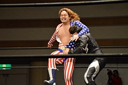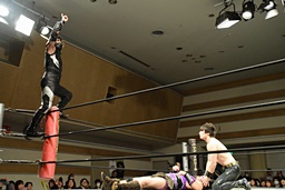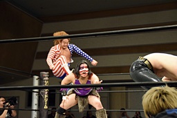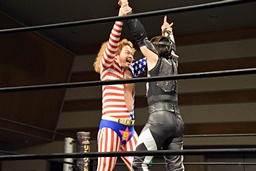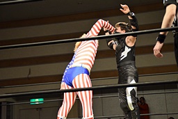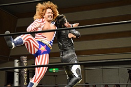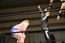 FUMAがSAGATをボディスラム、円華と2人でコーナーに上るが福田が阻止(右写真)。