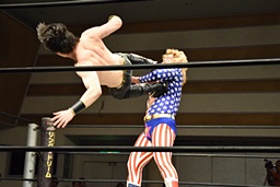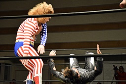 ロープに飛んでショルダーブロック(右写真)、SAGAT場外エスケープ。