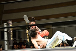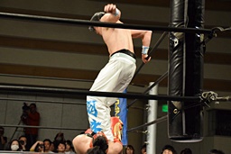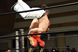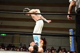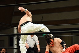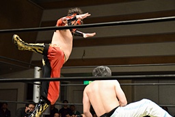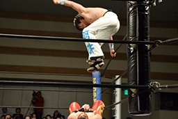 旭首投げからトップロープ越しのダブルフットスタンプ(右写真)。