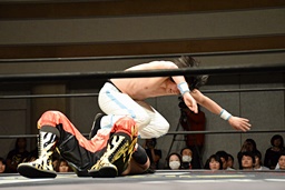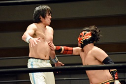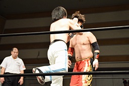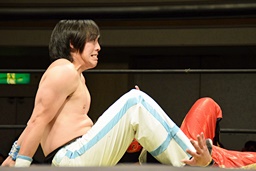 旭ロープに飛ぶ、久保足を取って倒す。旭の髪ヤバいな(左写真)。