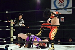 ロックアップ、福田ヘッドロック、FUMAがロープに振ってロープワーク、FUMAリープフロッグでかわし(左写真)フライングメイヤー、福田ヘッドシザーズでブレーク。