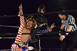 ロープに振る、FUMA切り返してバックエルボー、両手でメロイックサイン(左写真)。