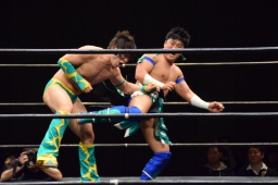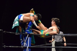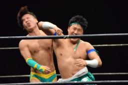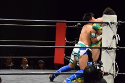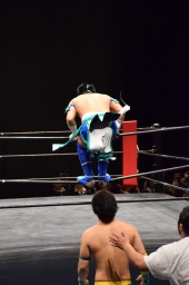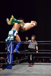 オースギコーナーに振って突っ込む、風戸ショルダースルー(左写真)、オースギはエプロンに着地。