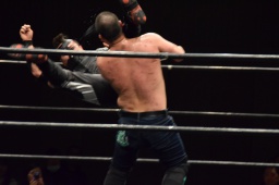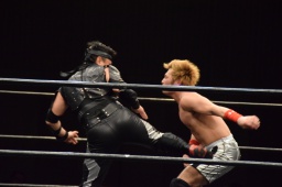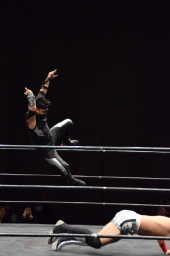 FUMAメロイックサイン、ロープに飛ぶ、関根カウンターのフライングショルダーブロック(左写真)