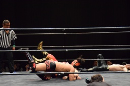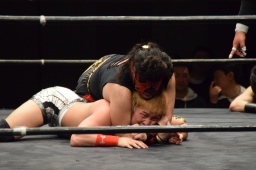 関根と岩本がカットに入ると久保と円華もスコーピオン・デスメタルロック(右写真)。中津がロープ。15分経過。