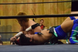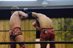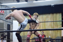 先発は風戸と岩本。ロックアップ、風戸腕を取る、ハンマーロックからヘッドロック(右写真)、岩本切り返す、風戸さらに切り返して田村にタッチ。