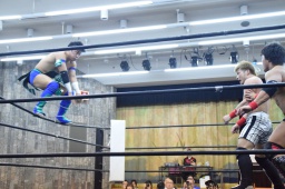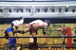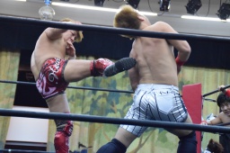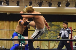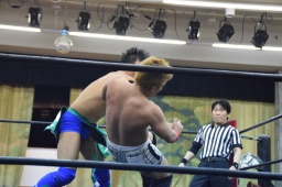 ロープに飛ぶ、風戸カウンターのドロップキック(右写真)、田村にタッチ。