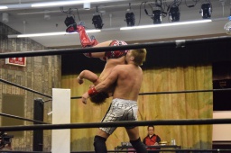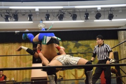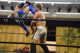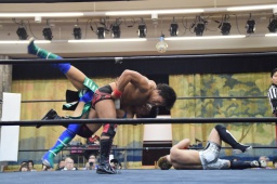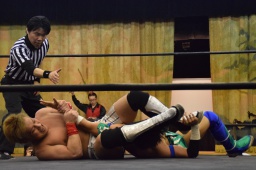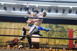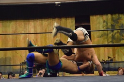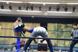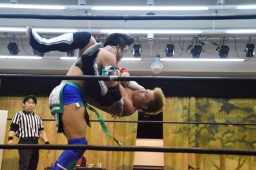 田村連打(左写真)、中津も連打、ブレーンバスター狙う、田村着地、