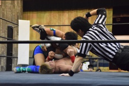 風戸ロープに飛んでフライングアックスボンバー(左写真)、カウント2。