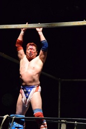 テリーコーナーに上り、福田を逆向きにすると(左写真)、