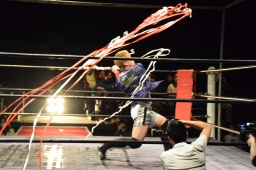 ロープに飛ぶ、中津カウンターのミドルキック(左写真)。