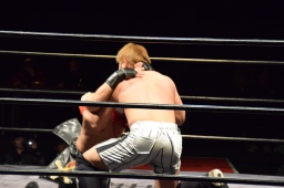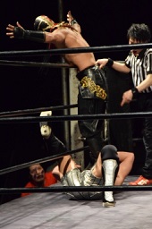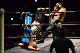 中津は寝っ転がって猪木アリ状態を挑む、政宗コーナーに(右写真)。