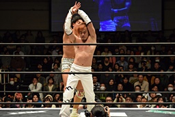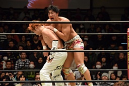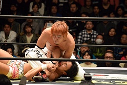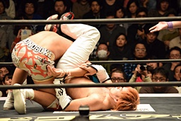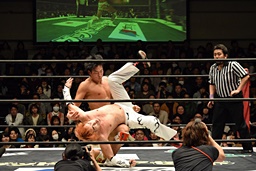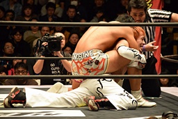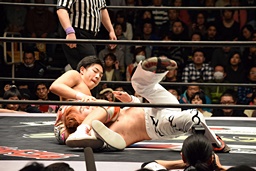 後方回転して起き上がると片逆エビに(左写真)。これは3年前の1月後楽園大会で竹下が飯伏にやられた攻撃。
