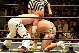 イサミまたヘッドロック、竹下持ち上げる(左写真)、