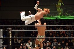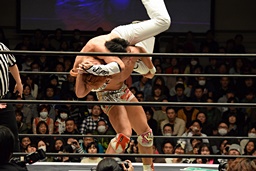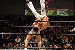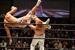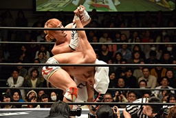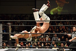 竹下バックドロップ、イサミ一回転して(右写真)着地、