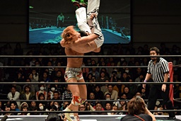 イサミコーナーに上ってダイビングダブルニードロップ、竹下かわしてバック取ると持ち上げて(右写真)、