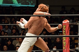 コーナーに上ってダイビングクロスボディ(右写真)。