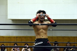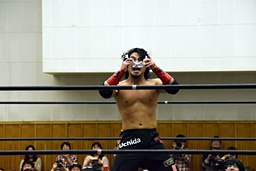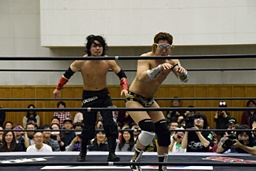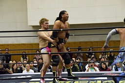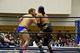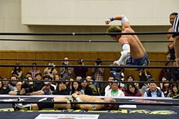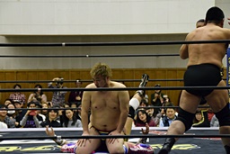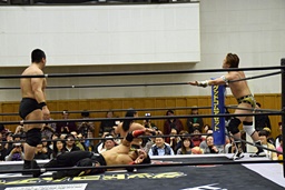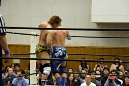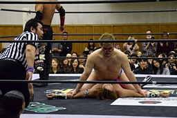 大石フィストドロップ(右写真)、松井レフェリーいつもと違ってナックル指摘しない。