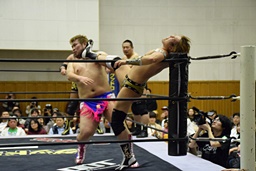 高木ドラゴンリングイン、内田ガットショット、河津落とし。さらにネックブリーカードロップ、コーナーに上る。高木は内田を側転クロスアタックでエプロンに落とし、ぶっこ抜き雪崩式ブレーンバスター(右写真)、しかしこれもノーメガネ。