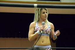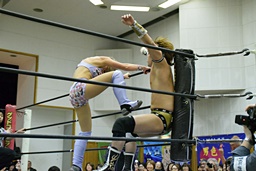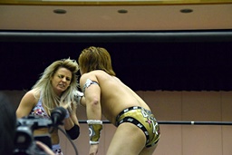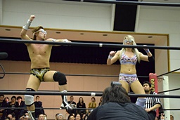 大社長が通訳のワンチューロを従えてリングに。3月の両国にWORLD CUTEST TAG TEAMを招聘することを即決(左写真)。