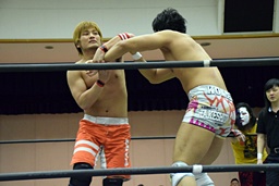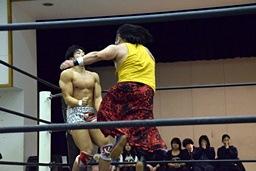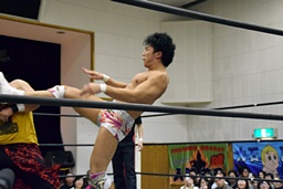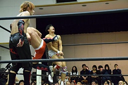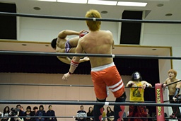 遠藤コーナーに振って串刺しエルボー、ロープに飛ぶ、イサミカウンターのドロップキック(右写真)。