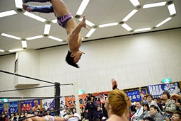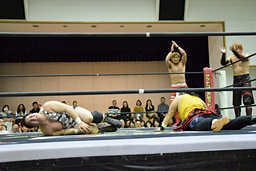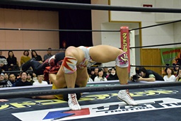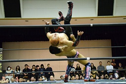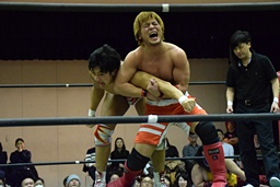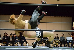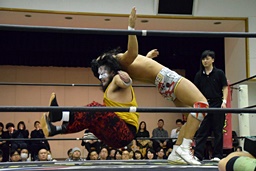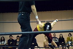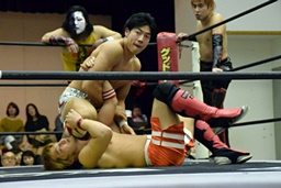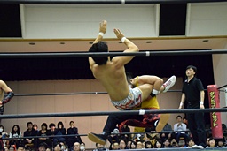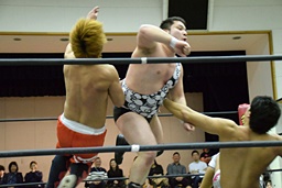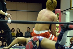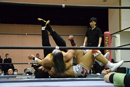 バックドロップの体勢、遠藤切り返してジャーマン、イサミ着地(左写真)、中津にタッチ。
