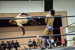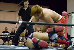 中津ワキ固めに切り返す(右写真)、ミドルキック、SAGATにタッチ。