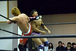 遠藤がイサミと中津にケブラーダ(右写真)。