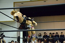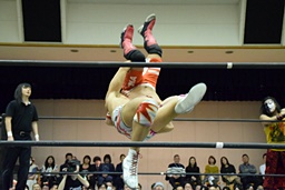 中津ロープに飛ぶ、遠藤ドロップキック(右写真)、竹下にタッチ。10分経過。