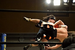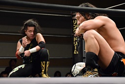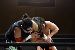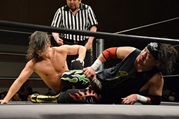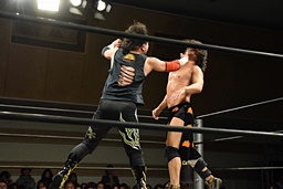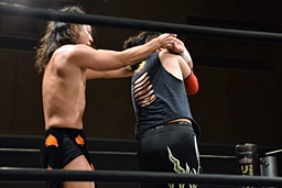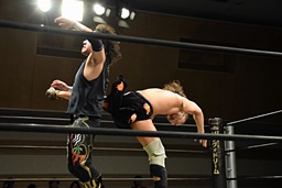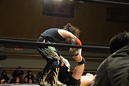 久保延髄蹴りからゴロースープレックス狙う、高梨ブロックしてタカタニック狙う(右写真)、