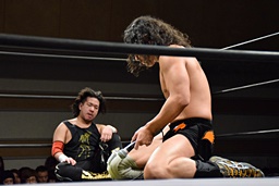 高梨「タイトルマッチ前にイサミを襲撃したり、真っ向からやったり、自分でも何言ってるかわかんなくなるぐらいブレブレだったけど、今日の試合を通じてまっさらな気持ちでイサミとぶつかりあえると思います。BASARAとか酒呑童子とかあるけど、今日アンタと闘えたからこういう気持ちになれた。ガラじゃねえけど、ありがとう。次、イサミと顔を合わせるのは後楽園ホールになるけど、今俺はこういう気持ちだった、ってイサミに伝えておいてくれ。」(左写真)