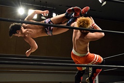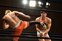 中津ロープに飛ぶ、遠藤カウンターのドロップキック(左写真)。