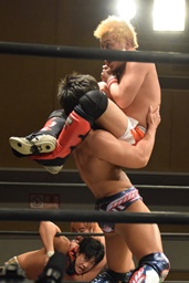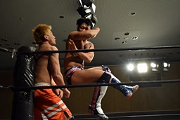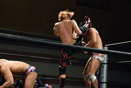 イサミがダイビングダブルニードロップでカットに行くが遠藤かわし(右写真)中津に誤爆。