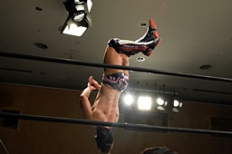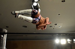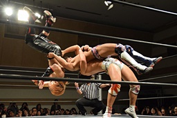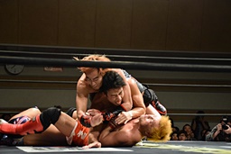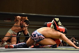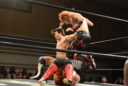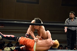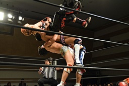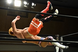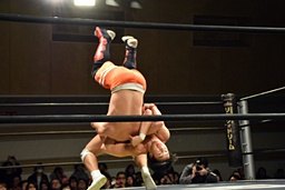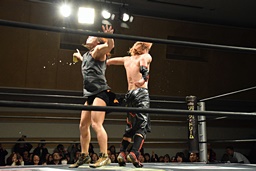 遠藤その場跳びシューティングスタープレス(左写真)、カウント2。遠藤コーナーに上ってムーンサルトプレス、中津かわし遠藤も着地。