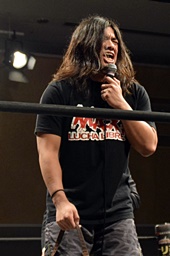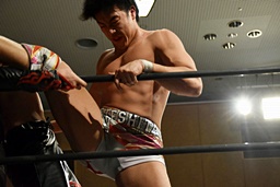 佐々木「次の挑戦者はこの俺、佐々木大輔だ!そのベルトは俺のもんだ! 3月の両国で挑戦させろ!」(左写真)