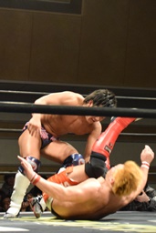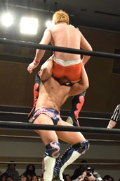 遠藤スワンダイブエルボー(左写真)、カウント2。