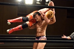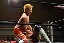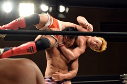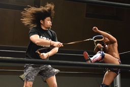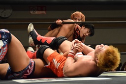 中津体を反らして腕を伸ばす(左写真)。竹下はエプロンでイサミにスリーパーで足止め。