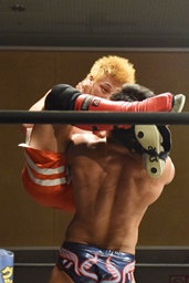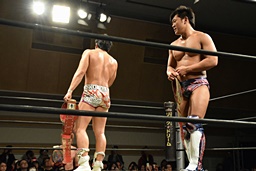 竹下「今日で僕らとイサミ選手のタイトルマッチ、僕らの1勝2敗やな。まだまだこれで勝ったとは思ってないから、タッグでもシングルでもやってください。ありがとうございました。」(左写真)