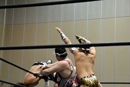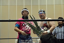 アントン平田に卍固め(右写真)、顔面にゴーヤを押し付けると平田ギブアップ。