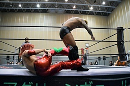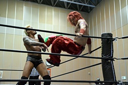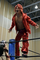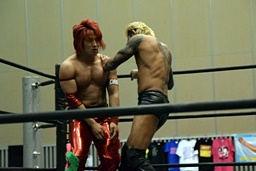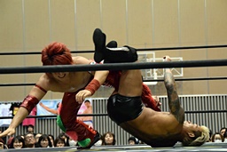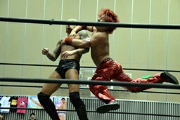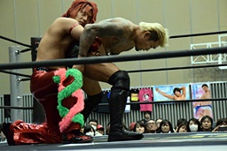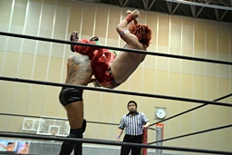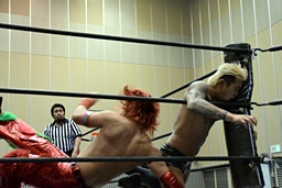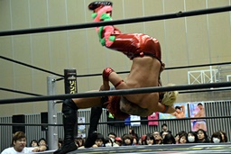 助走つけてドロップキック(右写真)。5分経過。両者場外に。