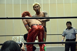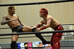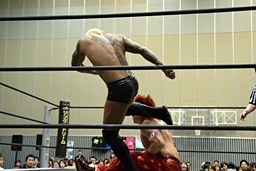 エプロンPK狙うが高尾かわし、坂口の足にドロップキック(右写真)。