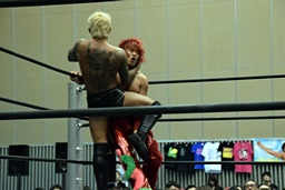 高尾コーナーに上ってミサイルキック、坂口スカす(右写真)。