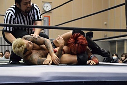 リングに戻してカバー、カウント2。腹パン(右写真)、