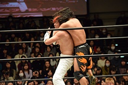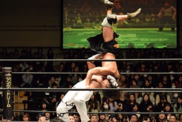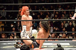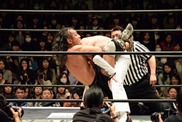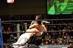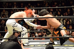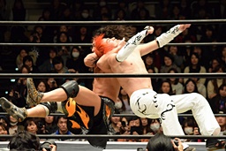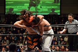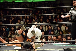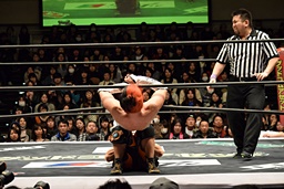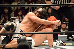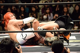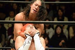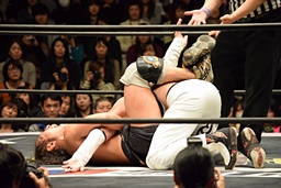 高梨反動をつけてジャイアントキラー(右写真)、カウント2。