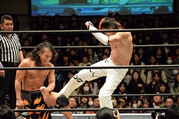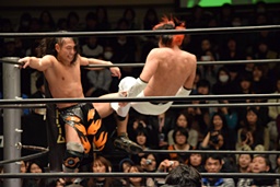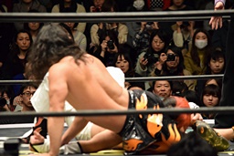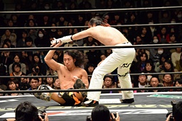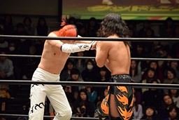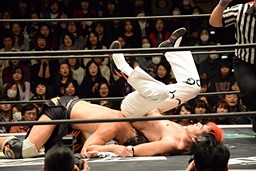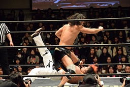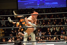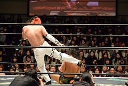 イサミローキック、首投げから背中にサッカーボールキック(左写真)、カウント2。